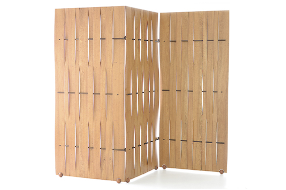 Biombo Tear, por Henrique Schreiber - Supõe-se que a partir da observação dos ninhos de pássaros surgiram as primeiras tramas de materiais naturais que, posteriormente, evoluíram para tecidos em um processo conhecido hoje como tecelagem. Como resultado dessa evolução surgiram os teares, equipamentos que tornaram os processos possíveis em baixa ou alta escala. O Biombo Tear foi concebido a partir da mesma dinâmica criada por nossos antepassados, fazendo uma mescla entre materiais amadeirados tensionados e barras de metal, ao tecer uma trama semiaberta de materiais nobres. Como resultado obtém-se uma peça de intervenção leve, que permite a divisão de ambientes e demarcações de áreas com elegância.