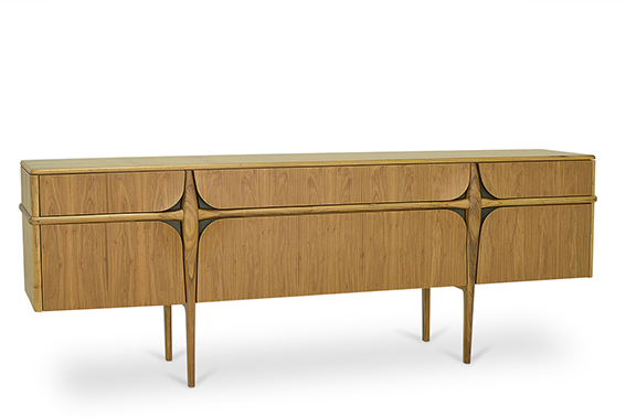 Buffet Josephine, por Amélia Tarozzo - Teve como inspiração o movimento art nouveau. Linhas orgânicas e femininas, curvas e sobreposição, mistura de materiais naturais; o couro e a madeira. A designer buscou traduzir com detalhes discretos porem expressivos a essência daquele movimento que prezava pela riqueza de detalhes e neste caso, dando forte importância à funcionalidade na parte interior do móvel com nichos para talheres, ganchos para xícaras e prateleiras para louças.