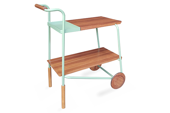 Carrinho Bar Contorno, por Rejane Carvalho Leite - O carrinho bar com sua estrutura leve e combinação de planos horizontais - ora em madeira, ora em alumínio - completa a atmosfera da coleção Contorno com versatilidade. O rodízio, em madeira, de fabricação própria, garante mobilidade e dá um charme especial à peça. A bandeja estrutural, em alumínio, serve de apoio para garrafas e copos, entre outros itens. O detalhe do pé e a pega conversam entre si, alinhando a leitura das formas.