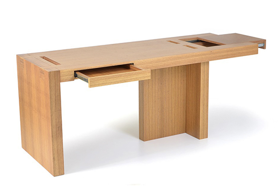 Escrivaninha Catete, por Ivan Rezende - A concepção da Mesa Catete parte de suas linhas simples e sua aparente simplicidade estrutural. Vencendo um grande vão, são desafiados os limites do material, apesar de sua estrutura interna. Os apoios da mesa se fazem por dois pés, que cumprem suas funções cada qual de maneira diferente: encaixe e apoio. Sua estruturação teve como elemento desafiador o largo vão, que somado à presença das gavetas e dos rasgos no tampo, se fez necessária à execução de um “esqueleto interno”, garantindo sua firmeza sem interferir no desenho e rigor geométrico da mesa. Os rasgos compõem sua geometria e se relacionam com o encaixe e desenho dos pés e possibilitam a passagem de fios, no caso da utilização de equipamentos eletrônicos, como computador e luminária. O pé lateral dá a sensação de continuidade do tampo e o pé intermediário, em T, serve de apoio para o tampo e faz de seu desenho um “nicho” para acomodação de carrinho volante com gaveteiro ou base para CPU, de acordo com necessidade do usuário. Evidenciando o desenho da madeira, o sentido dos veios acompanham as linhas da mesa. Tampo e pés têm a mesma espessura, dando a impressão de peças de uma mesma superfície. Na espessura do tampo se “escondem” 02 gavetas, pouco profundas, projetadas para guarda de papeis e alguns utensílios de escritório. Foram executadas em meia esquadria, para que, quando fechadas, não se mostrem evidentes.